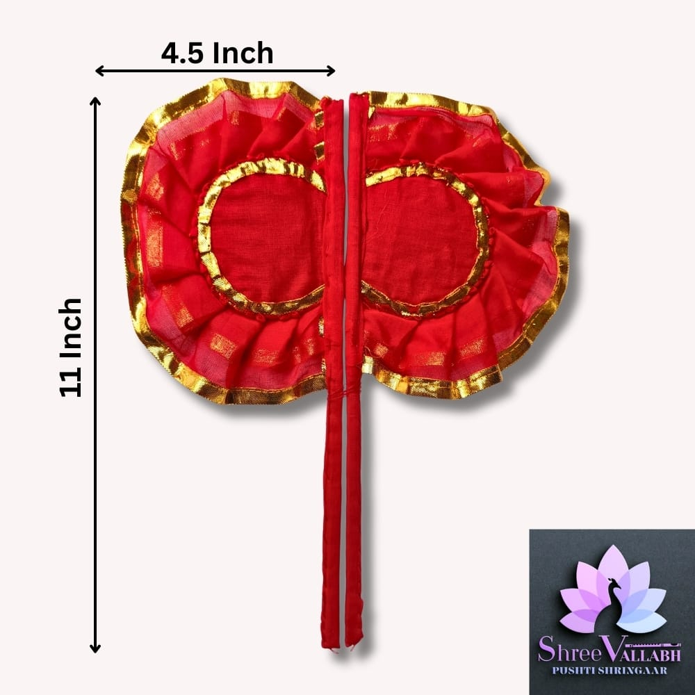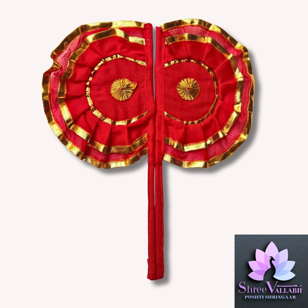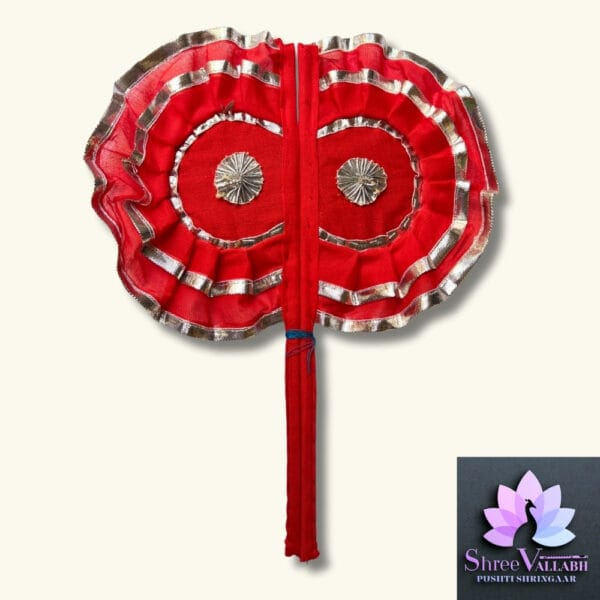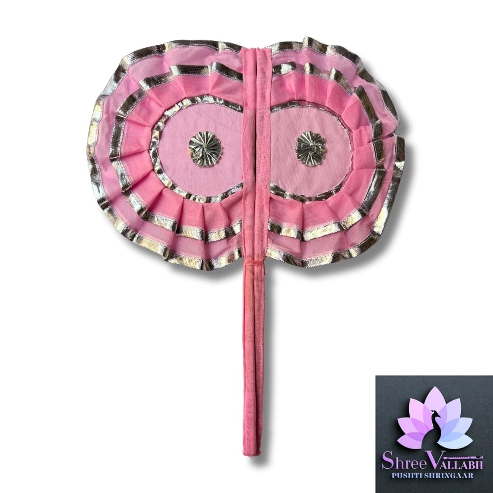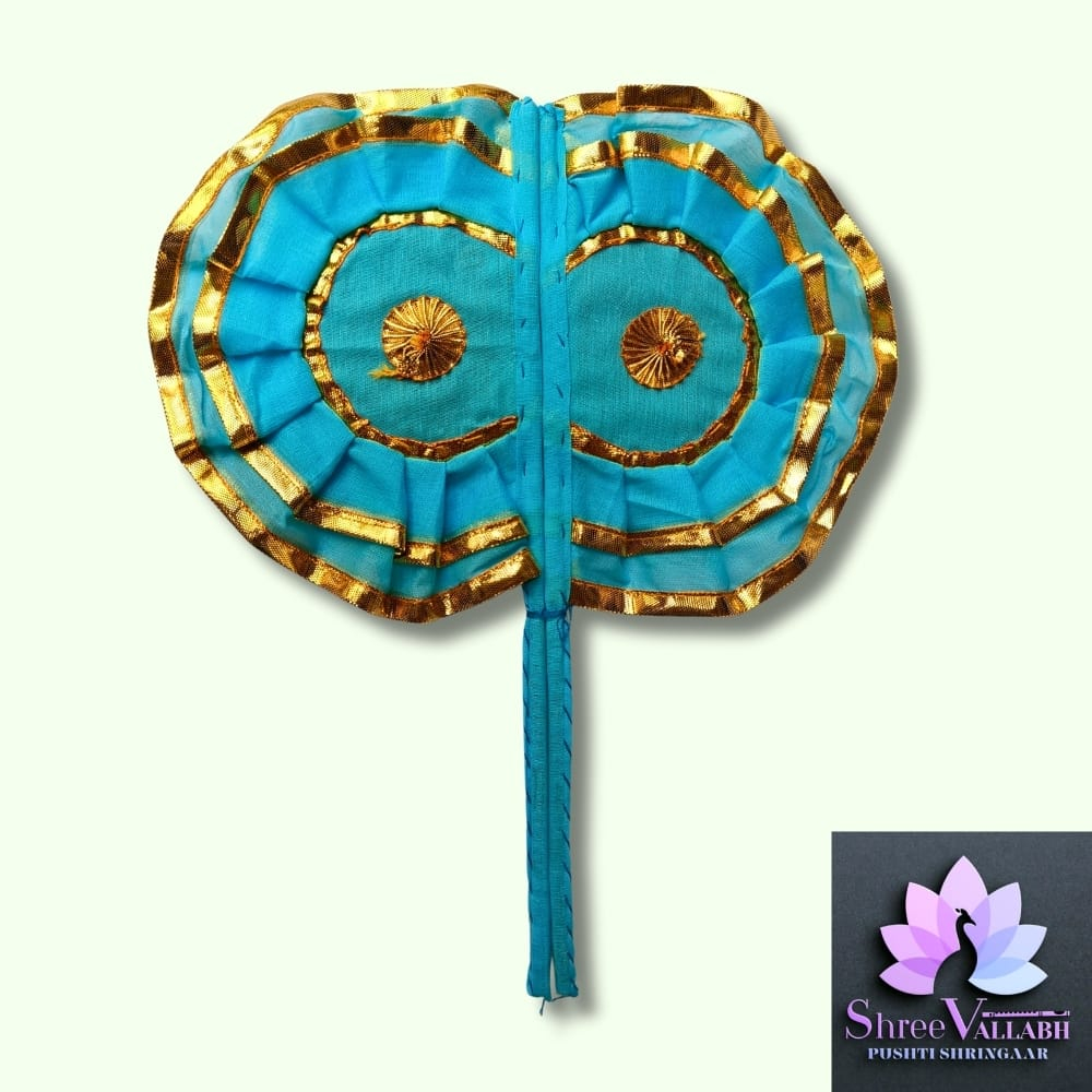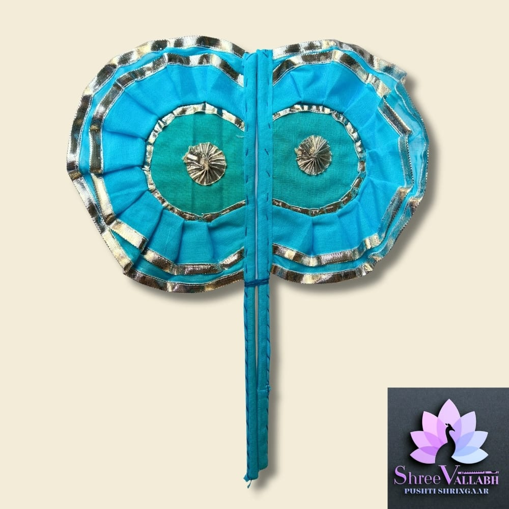 COTTON PANKHA/VINZANA is available in various color ,select the color you like for your prabhu. This pankha/vinzana is available in all size ,select the same as per your Prabhu’s size.Zari Pankha/Vinzana is one of the shringar accessories of Laan/Bal Krishna gaadiji shringar and availble in silver color lace and khus at center.